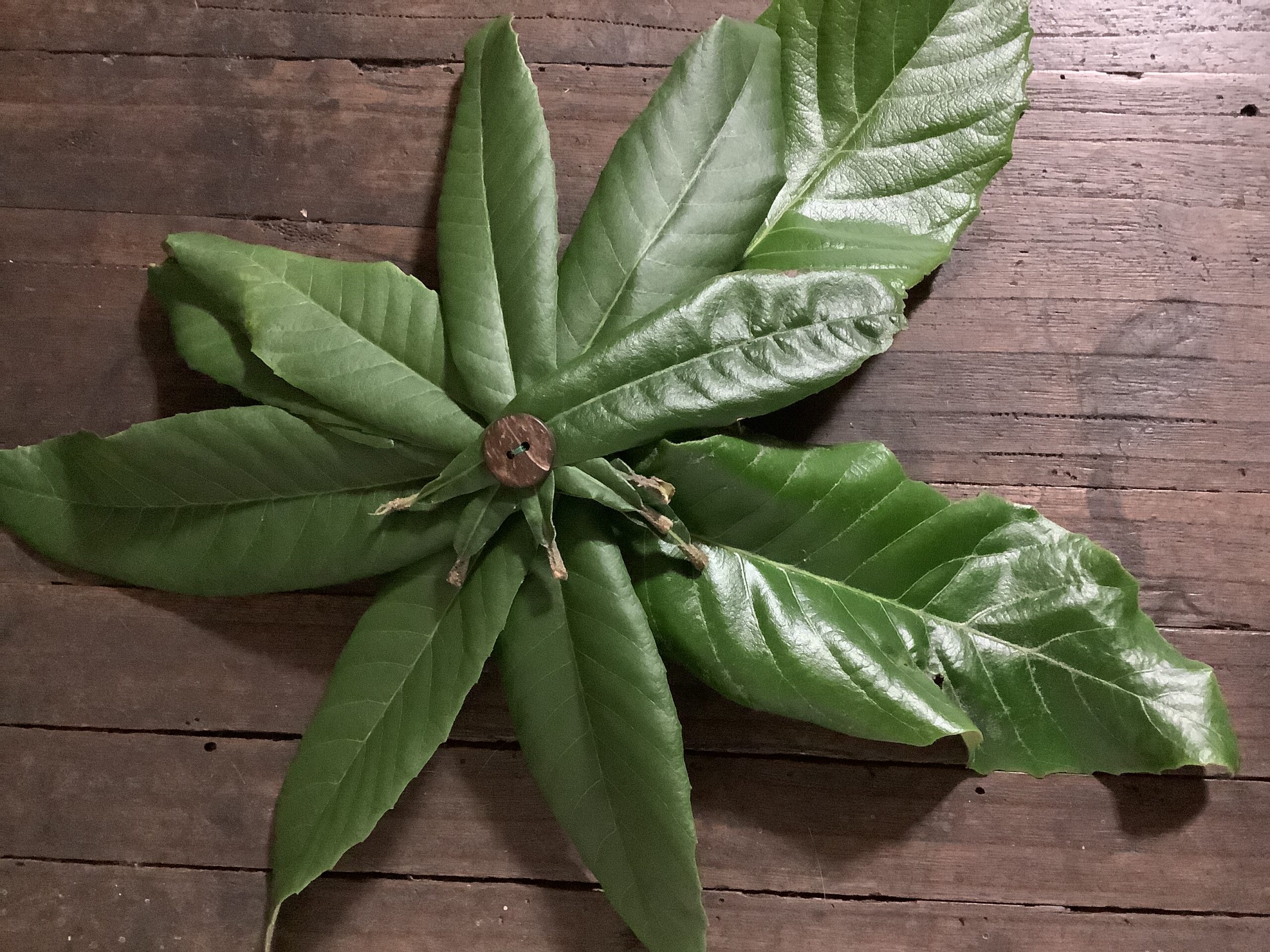 針と糸でビワの葉を縫い合わせたビワの葉帽子。