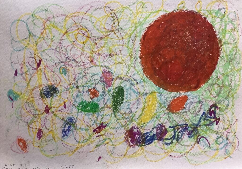 今回のワークでも、色と線を描き、言葉をみつけ、身体を使って作品を動き、言葉を紡ぐ、、という流れの中で、参加者のみなさまそれぞれの内なる宇宙の物語がぱぁ~っと花開いたようでした。