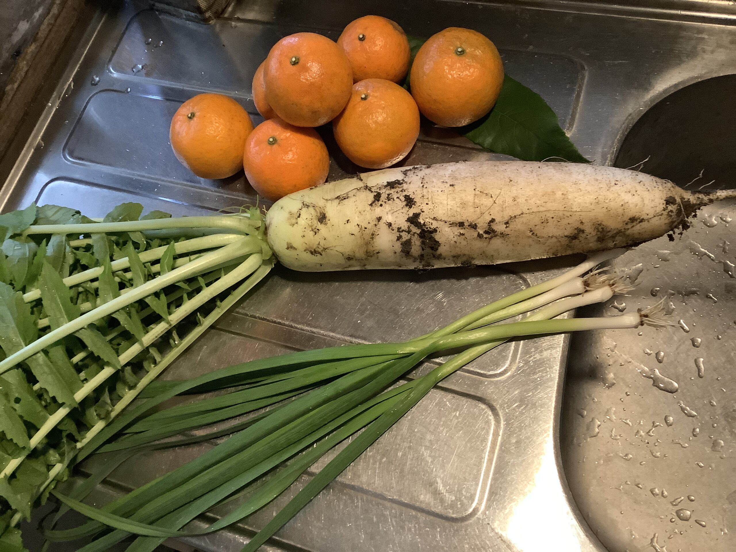 ご近所さんがとれたての大根とフル(にんにくの葉)を