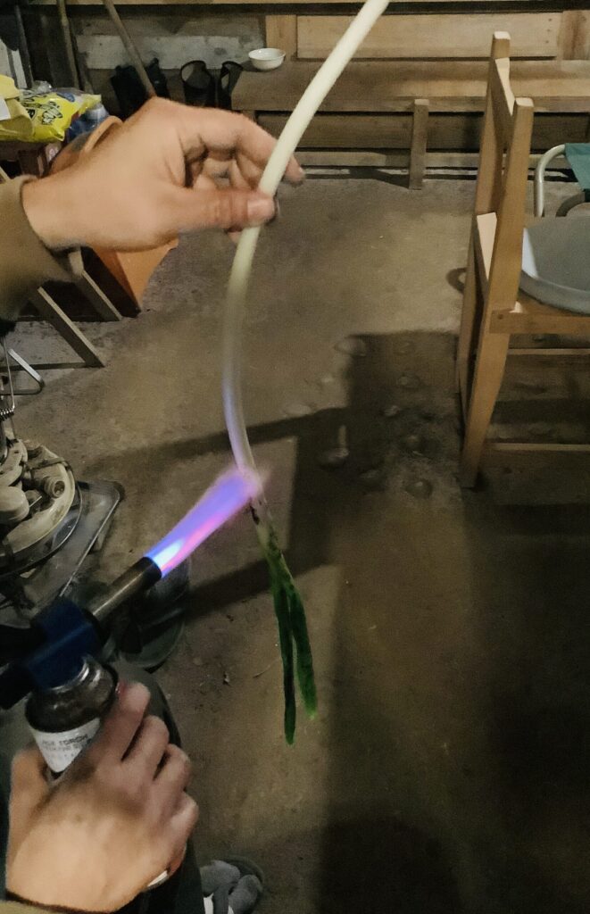 富山の葱を、まるごと手に持ってバーナーで焼きながら